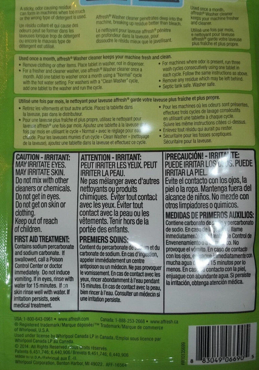 Affresh Washer Cleaner Tablet for Residue/Odor/Mildew 6 PAK W10135699 W10501250