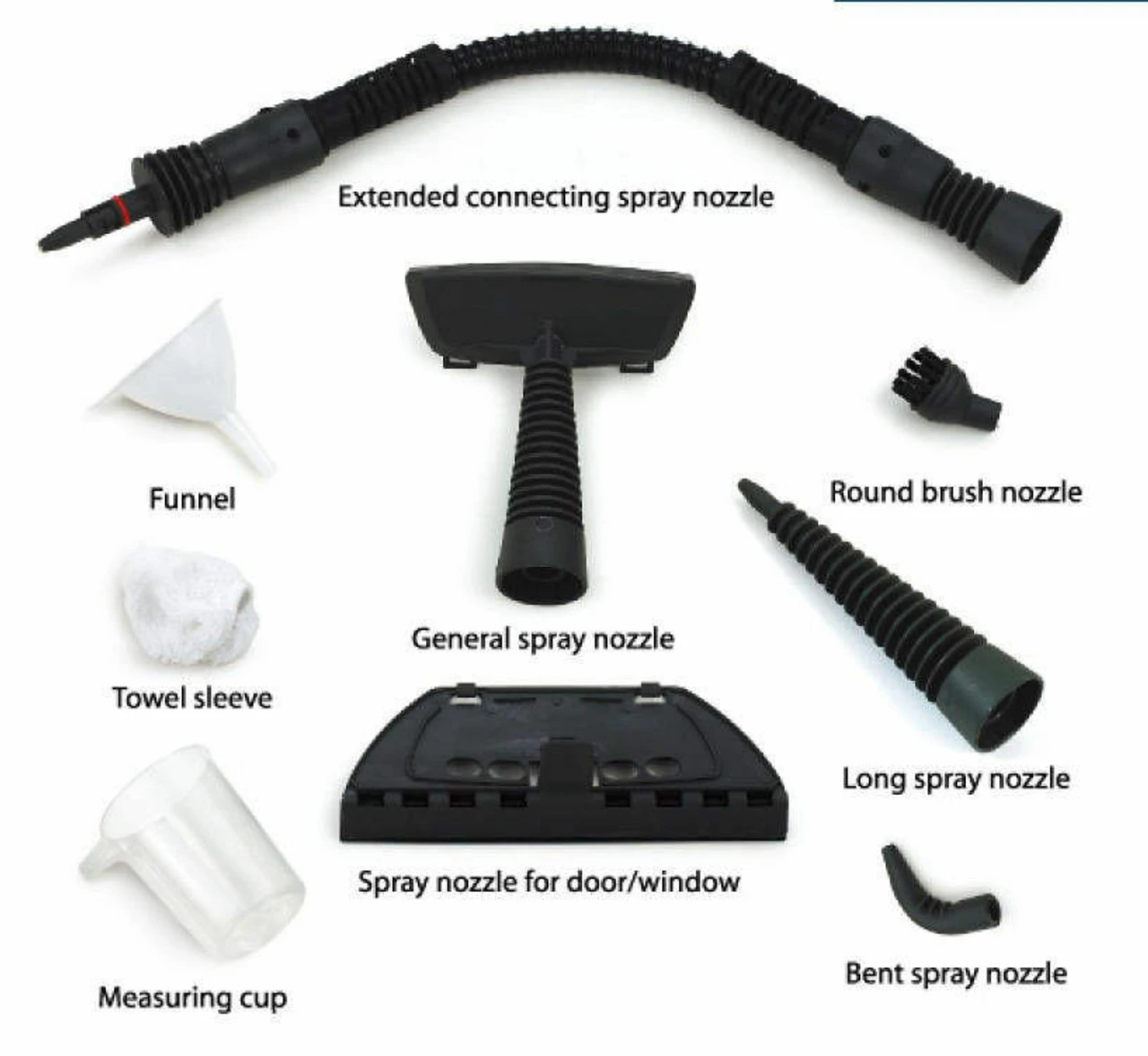 - 9 Foot Power Cord For Easy Mobility also Includes a Flexible extension hose, Bent spray nozzle, Round brush nozzle, Long spray nozzle, Door/window nozzle and more