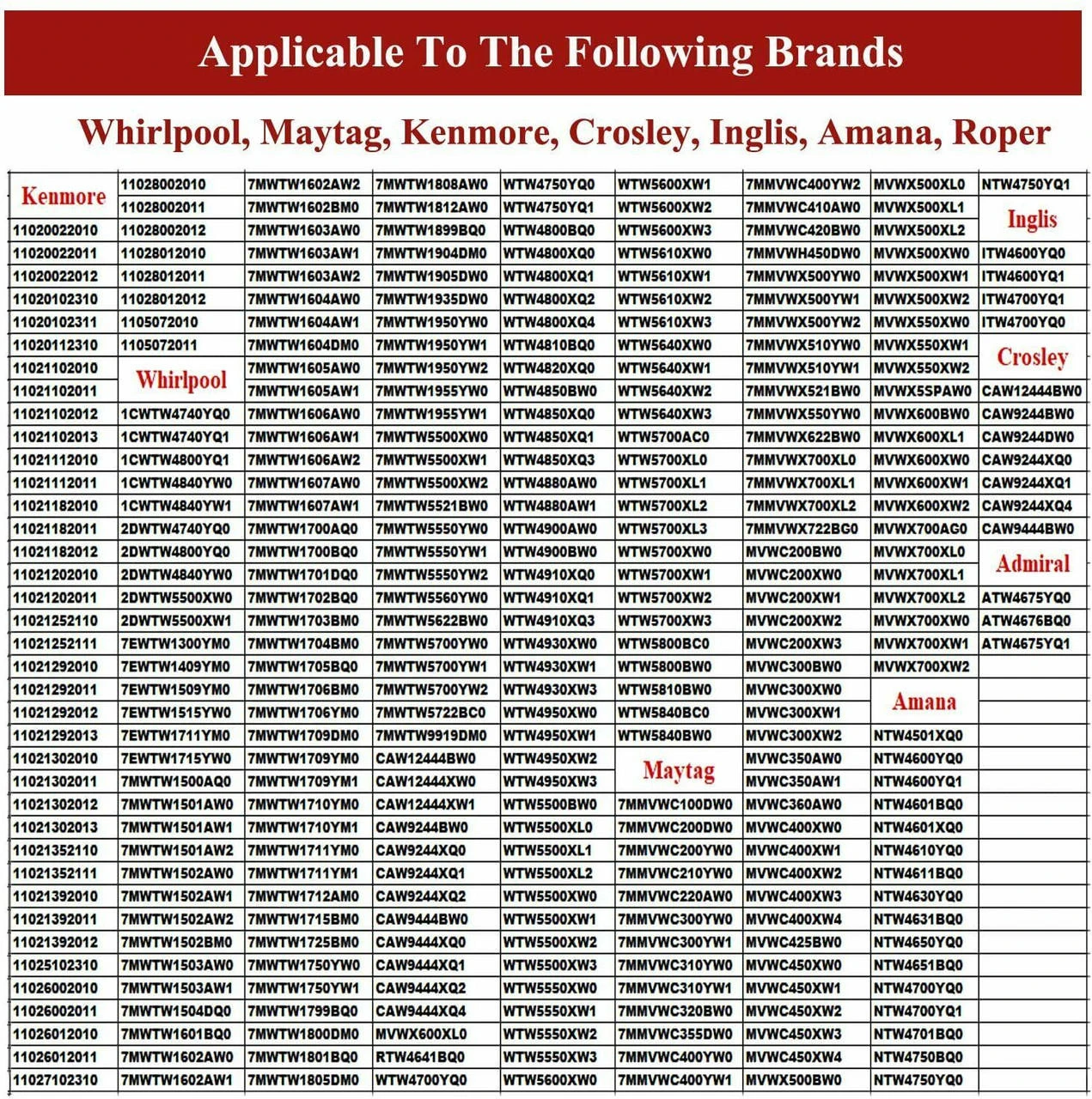 Fits models : 1CWTW4740YQ0, 1CWTW4740YQ1, 2DWTW5500XW0, 2DWTW5500XW1, 7EWTW1300YM0, 7EWTW1409YM0, ATW4675YQ0, ATW4675YQ1, MVWC300XW2, MVWC350AW0, WTW4700YQ0, WTW4750YQ0,NTW4600YQ0 etc.