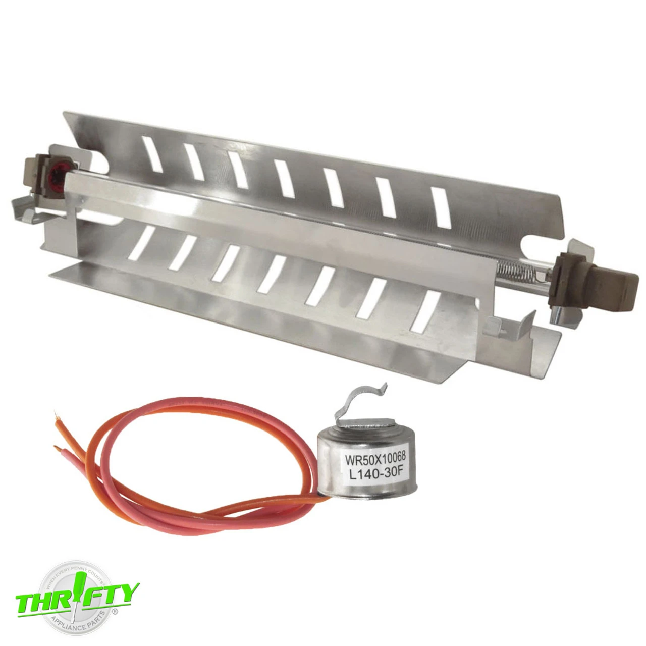 Replacement defrost heater and thermostat used for some Americana, GE, Hotpoint, and Kenmore refrigerator models.